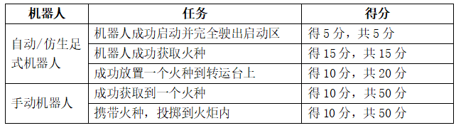 【速胜挑战赛】第二十四届全国大学生机器人大赛ROBOTAC挑战赛规则发布!发表时间:2024-11-28 11:08 ![]() ROBOTAC 第二十四届全国大学生机器人大赛 ROBOTAC挑战赛 速胜挑战赛规则 正式发布! 规则要点 ROBOTAC速胜挑战赛是自动/仿生足式机器人和手动机器人的任务赛,比赛过程中自动/仿生足式机器人完成矿石获取及传递的任务,手动机器人获取转运台上或升降台上的火种,并将其投入主火炬。 每场比赛2分钟,每支队伍有2次比赛机会,取2次中最好成绩为最终成绩。 任务得分: ![]() 比赛用时: