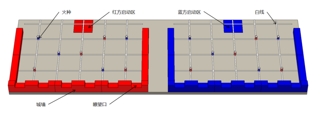 ![]() ![]() Competition Field and Props 2.1 场地及尺寸 Field and Dimensions 比赛场地尺寸为单方场地4200mm×3200mm,场地尺寸图见图2-1。其他道具尺寸如附图。 The competition field measures 4200mm x 3200mm for each side of the team. Further specific details of dimensions are shown in Figure 2-1. Other props’ size is shown in Appendices. 地面由600mm×600mm×12mm的爬行垫铺设。 The surface of the playing field is covered with 600mm x 600mm x 12mm foam mats. 双方各有1个600mm×600mm的启动区,设置位置如图2-1所示。 Each team has a 600mm x 600mm starting zone. Locations are indicated in Figure 2-1. ![]() 图2-1 比赛场地图 Figure 2-1 Competition Field 2.2 火种区 Flame Zones 场地内红、蓝两方机器人只允许在本方半场内运行,表面铺设600mm×600mm×12mm的绿色爬行垫铺设。贴有宽度为30mm的白线。纵、横白线交叉形成15个交点,依次编号为A、B……N、O,8个火种(每方各有4个蓝火种,4个红火种)将在赛前抽签随机放置在交点上。 The moving area of the robots are restricted to their respective halves of the field of their own sides, which are covered with green foam mats (600mm x 600mm x 12mm). The moving area includes white lines, 30mm wide, running vertically and horizontally to form a grid with 15 intersections labeled A, B, C...to O. Eight flame props (4 red, 4 blue) are randomly placed at these intersections before each match based on a draw. 2.3 火种 Flames 火种外形如图2-2所示,由组委会统一提供。火种为圆柱形发光体,外部材质为软硅胶,长约125mm,中间直径约65mm,两端直径约70mm,重量约为280g。火种详细尺寸见附图2。火种掉落地上可以继续捡起使用,重试操作可以重新放置位于机器人上的火种,如果火种掉落到场外,则不可以再使用本火种。 As shown in Figure 3-3, flame props are provided by the committee. The flames are cylindrical light-emitting objects, which are made of soft silicone, measure approximately 125mm in length, with a middle diameter of 65mm and end diameters of 70mm. Weight: ~280g. The specific measures and details of flame props are shown in Appendices 2. The retry operation can reposition the spark located on the robot, but props on the playing field or castle walls cannot be moved. Flames props that fall out of the playing field cannot be reused. ![]() 图2-2 红、蓝火种 Figure 2-2 Red and blue flames props 2.4 城墙 Castle Walls 城墙外形如图2-3所示,每段城墙均有凹陷处,这处低矮的部分叫做瞭望口,城墙上表面(含瞭望口上表面)都可以放置火种,根据比赛结束时火种放置的情况,确定本队最终得分。 The castle walls are shaped as shown in the Figure 2-3. The castle walls feature recessed “watchtower slots,” where flame props can also be placed. Final scores depend on the placement of flame props at the end of the match. ![]() 图2-3 城墙尺寸图 Figure 2-3 Castle Size ![]() ![]() Robots 每支参赛队只允许一台机器人上场,该机器人可以是自动的也可以是手动的。不允许使用空中飞行机器人。 Each team may deploy only one robot, which can be either manual or automatic. Aerial robots are prohibited. 机器人必须从启动区启动,尺寸不得超过600mm*600mm*750mm(高),比赛开始后也不能超出上述尺寸限制。重量不得超过10kg。 Robots must start in the starting zone, the dimensions of the robot shall not exceed 600mm x 600mm x 750mm (height). Weight limit: 10kg. Robots must remain within these size and weight constraints throughout the match. 机器人不得做出以下动作: The robot shall not perform the following actions: (1)攻击对方机器人; (1) Attacking the opposing robot, (2)进入对方半场。 (2) Entering the opponent’s half-field. 3.1能源 Power Supply (1)机器人的电源标称电压必须低于12VDC,(电池时充满电会略超过12V,属于正常现象) Robots must operate on a power supply with a nominal voltage below 12VDC. (Slight over-voltage when fully charged is acceptable.) (2)不允许使用气、液压动力及其他组委会认为危险和不适当的能源 Pneumatic, hydraulic, or any other considered potentially hazardous and inappropriate by the committee power sources are prohibited. 3.1重量 Weight Limits (1)每支参赛队上场的机器人重量不得超过10kg。 Robots must not exceed 10kg. (2)总重包括能源和机器人所有部件的重量,不包括遥控器、备份电池和备件。 The total weight includes all components of the robot and power sources. This does not include remote controllers, back-up batteries, or spare parts. ![]() ![]() Teams (1) 每支参赛队最多6名队员,队员需为在籍学生,专业不限,可以跨校组队,可以与中国籍学生联合组队,联合组队时外籍学生比例应不小于50%。 Each team may have up to 6 members. All members must be currently enrolled students, regardless of academic major. Cross-university team formation is permitted. Teams may collaborate with Chinese students, but in such joint teams, international students must account for no less than 50% of the total members. (2) 各参赛队选出队长1名,负责全队的日常组织与管理。本队若出现违反组委会规定或者备赛中途退出等违背竞赛精神的行为,队长需负主要责任。 Each team must select one team leader responsible for the daily organization and management of the team. The team leader will bear the primary responsibility for any actions that go against the spirit of the competition. ![]() ![]() Match 5.1 计分 Scoring (1)手动机器人将火种运输到城墙,每个成功放置在高台处的得10分,每个成功放置在低台处的得5分,每个部分既有一个蓝色火种,又有一个红色火种定义为成双,每组成双的火种组在原有得分的基础上乘1.5倍系数。 For manual robots: The manual robots transport the flame prop