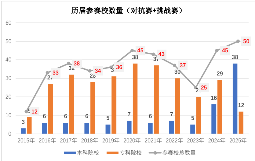 参赛校数量逐年增长,ROBOTAC自2015年纳入大赛体系以来,规模持续扩大。