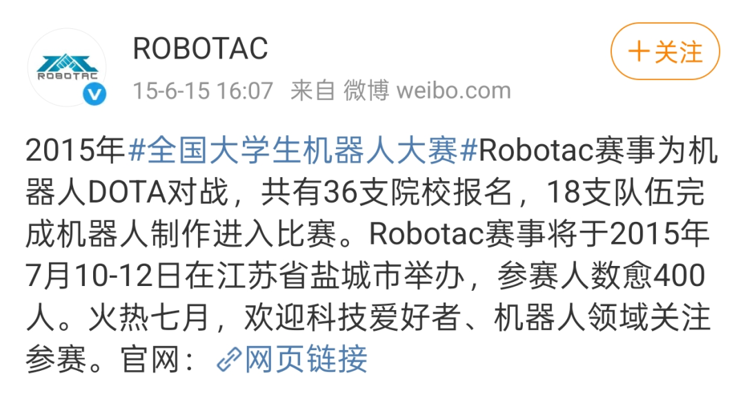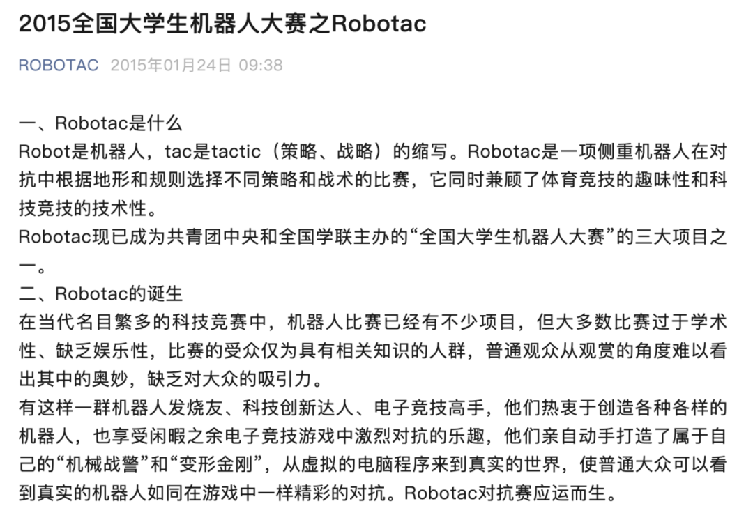 1月24日,Robotac赛事官方微信公众号发布首篇推送《2015全国大学生机器人大赛之Robotac》,为赛事信息发布、规则更新、队伍互动及影响力提升开辟一条重要的传播渠道。