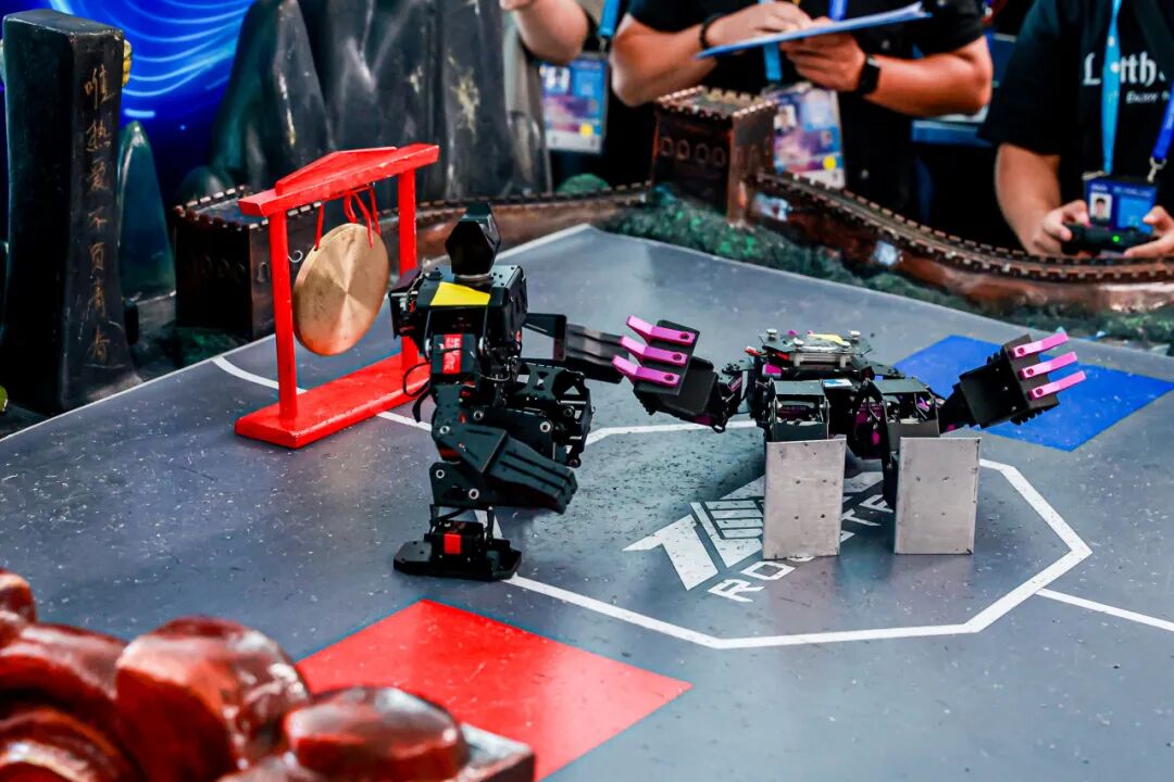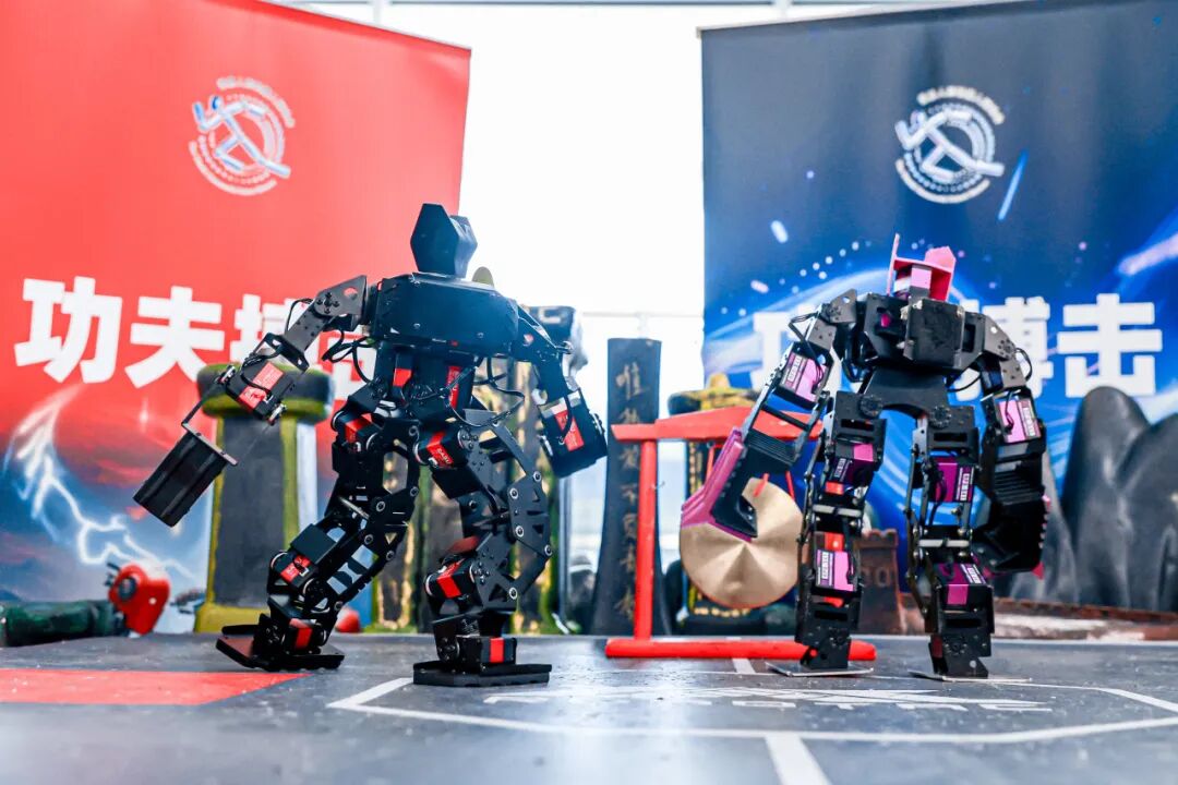 人形功夫搏击赛是全国大学生机器人大赛ROBOTAC的特色赛项之一,其竞赛形式为小型双足人形机器人之间的1V1对抗赛。在比赛正式开始前,参赛的双方机器人需在指定的启动区内静候待命,待任意一方成功敲击场地边缘的开场锣后,这场激烈的较量方能正式启动。比赛中,机器人选手们通过有效击打对方,导致对方摔倒或出界,从而得分。