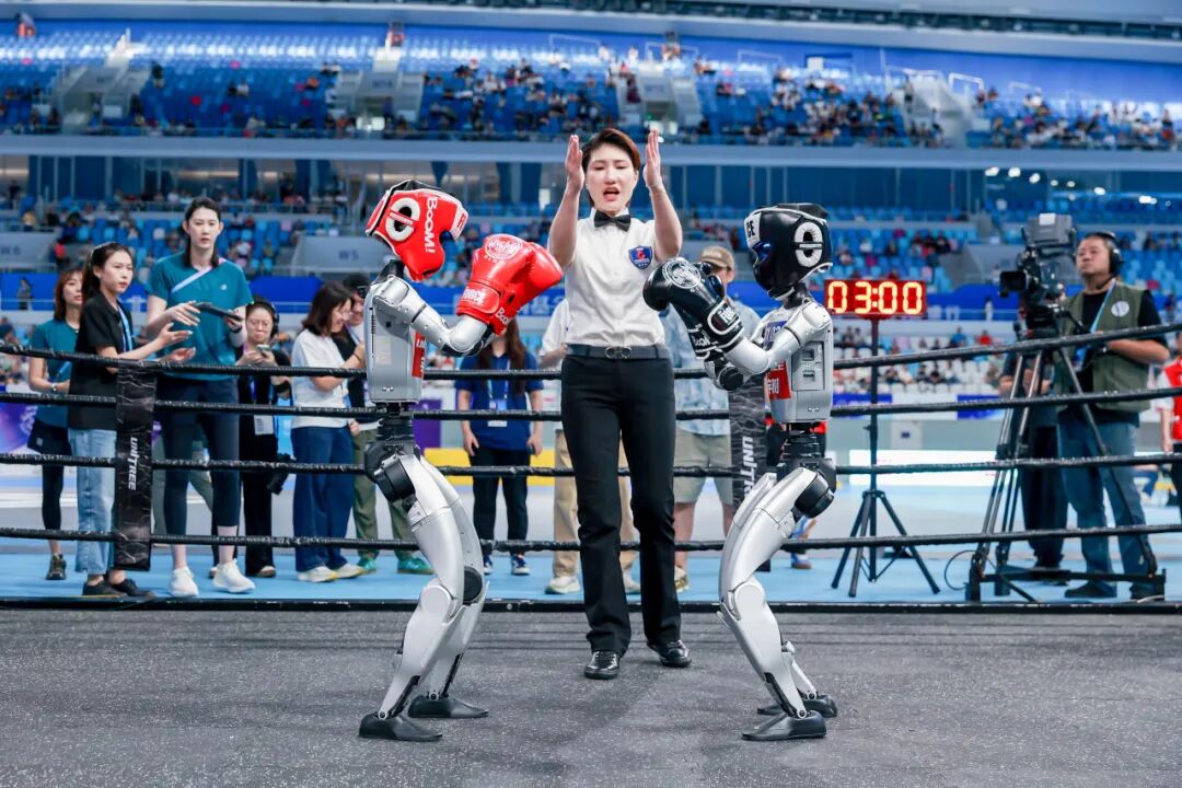 在速滑馆的比赛现场,观众们的欢呼声、呐喊声此起彼伏,气氛热烈。在功夫搏击赛的精彩对决中,小型双足人形机器人展现出了惊人的灵活性和精准打击能力。在操作手的精准控制下,这些小型机器人们在赛场上灵活地腾挪转移,每一次颇具战术性的击打都让观众们惊叹不已,仿佛置身于一场科技感十足的科幻电影之中。